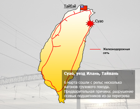 A freight train collapsed on March 6 near the town of Suao (county of Yilan, Taiwan). The incident occurred at 9:24 am near the Yongli station, where the railway traffic was paralyzed between the cities of Suao and Tongala. There were no human casualties, but 200 meters of power lines and two electricity towers were damaged. The accident affected around 40 passenger trains with more than 12,000 passengers.