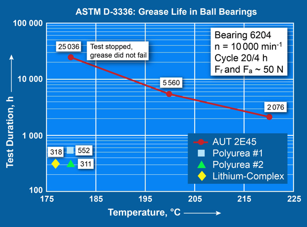 Laboratory results from ‘ASTM D-3336: Standard Test Method for Life of Lubricating Greases in Ball Bearings at Elevated Temperatures’ clearly demonstrated the potential for a truly ‘lubed-for-life’ solution for industrial electric motor ball bearings. In the accelerated life test, Krytox® AUT 2E45 retains its excellent lubrication effect over the long term when compared to industry standard electric motor bearing greases.