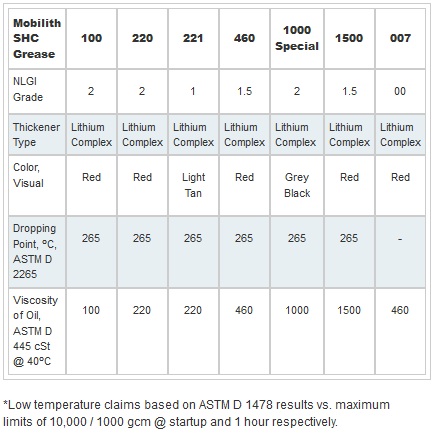 Application Considerations: While Mobilith SHC Series greases are compatible with most mineral oil based products, admixture may detract from their performance. Consequently it is recommended that before changing a system to one of the Mobilith SHC Series, it should be thoroughly cleaned out to achieve the maximum performance benefits. While the Mobilith SHC Series greases share many performance benefits, their applications are best described in terms of each product grade: